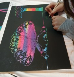 Wir basteln Masken mit Glitzersteinen, erstellen Kratzbilder u.v.m.