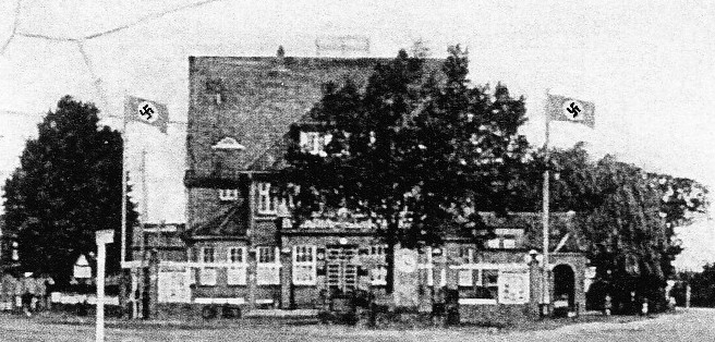 Bild: Gasthaus Doppeleiche am Eidelstedter Platz in den 1930er Jahren mit Hakenkreuz-Flaggen – Postkarte
